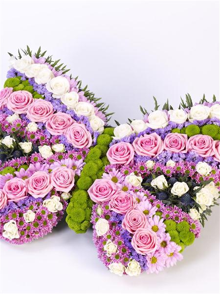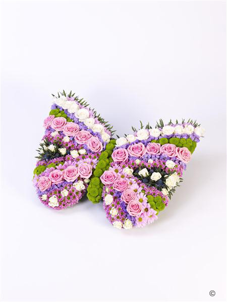 An array of pinks, lilacs, lime green and white make up this beautiful butterfly-shaped floral tribute. The display features spray chrysanthemums, pink and white roses, blue eryngium, lilac statice and lime green spray chrysanthemums.