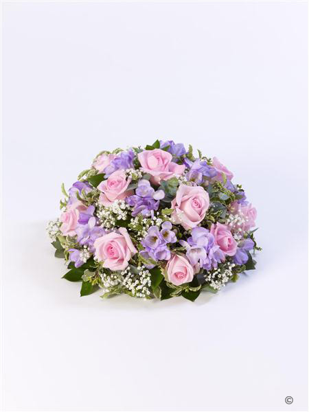 Roses and scented freesia in soft pink and lilac are nestled amongst choice foliage in this classic posy design.