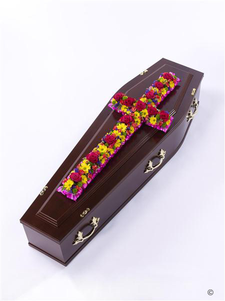 A classic cross covered with a mass of flowers in vibrant shades including roses, spray carnations, spray chrysanthemums and statice. Approximate height 153cm (5ft).