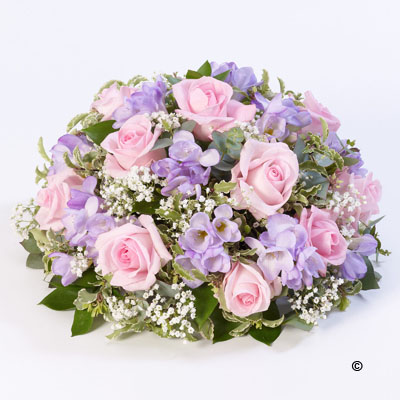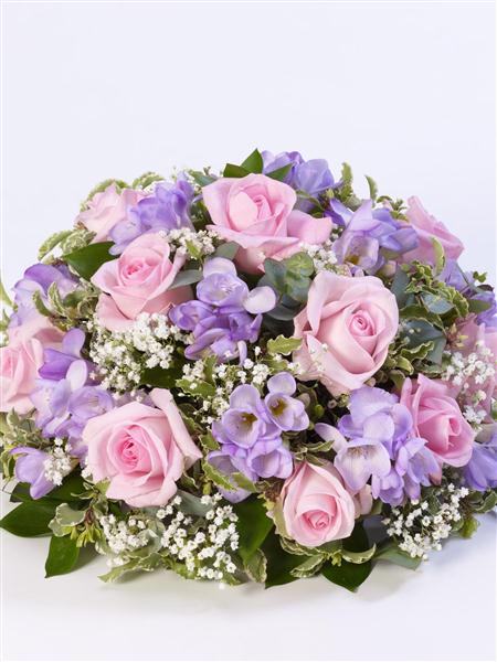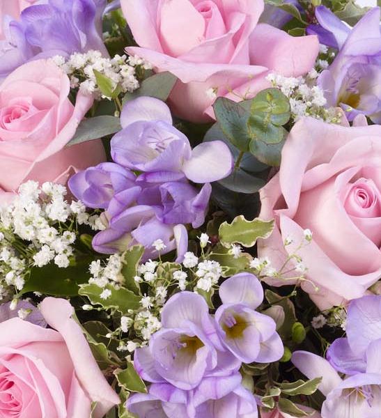 Roses and scented freesia in soft pink and lilac are nestled amongst choice foliage in this classic posy design.