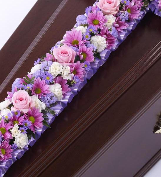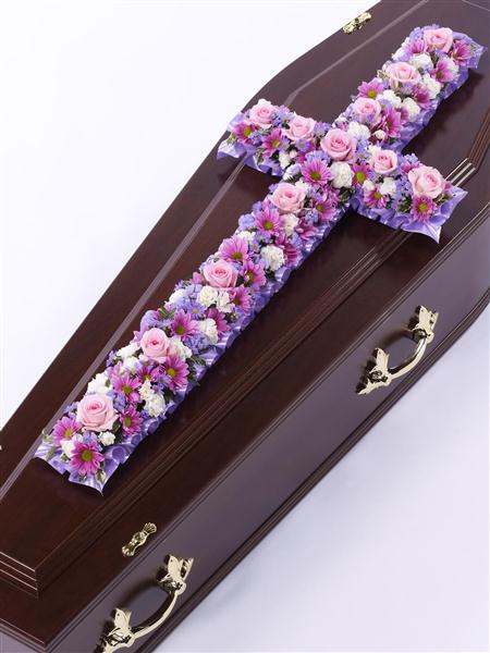 A classic cross covered with a mass of pink and lilac flowers including roses, spray carnations, spray chrysanthemums and September flower. Approximate height 92cm (3ft).